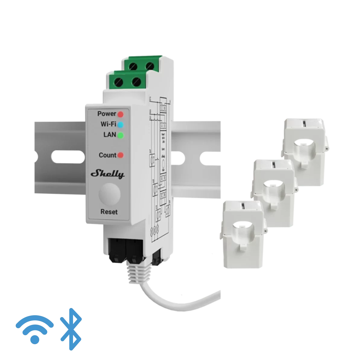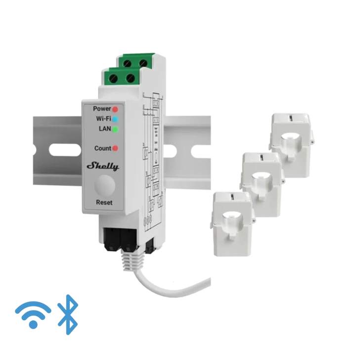 Shelly Pro 3EM je napredni trofazni energy meter koji mjeri aktivnu i prividnu energiju, struju, napon i faktor snage po fazama. Uređaj je opremljen modernim Gen2 firmware-om, podrškom za Wi-Fi, Bluetooth i LAN te omogućuje povijesni zapis podataka do 60 dana s rezolucijom od jedne minute. Podržava MQTT, Modbus i LAN komunikaciju te se može integrirati s različitim pametnim sustavima i platformama za monitoring.